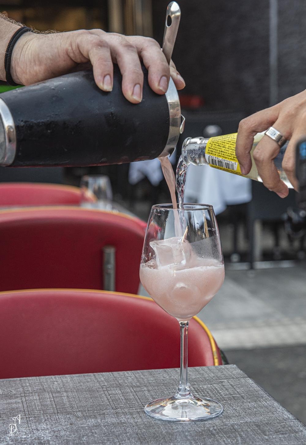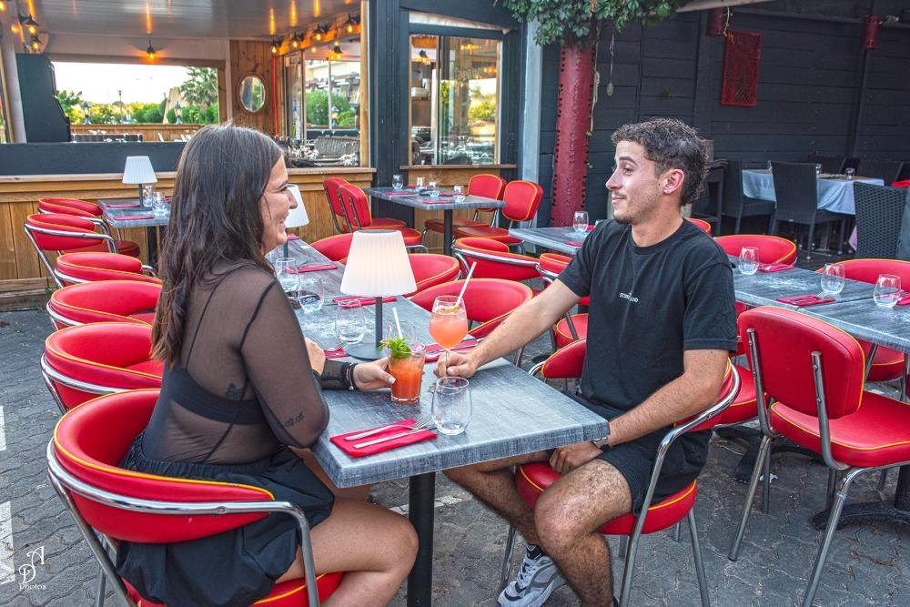 Dans un esprit bistrot rétro aux tonalités rouges, la terrasse s’ouvre sur l’une des places les plus animées du Village Naturiste.